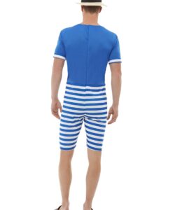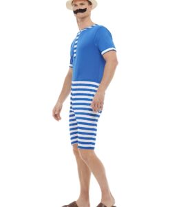 Take a dip into vintage style with this playful 20s Bathing Suit Costume. Featuring a classic blue and white striped short jumpsuit, matching hat and novelty moustache, this outfit recreates the instantly recognisable 1920s seaside bathing look.