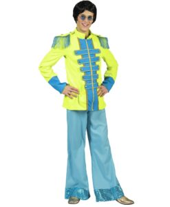Make a bold retro statement with this striking 60s Sgt Pepper–style Beatles Jacket in vibrant lime and turquoise. Inspired by the iconic military-style jackets worn during the late 1960s, this piece is packed with colour, detail and stage presence.