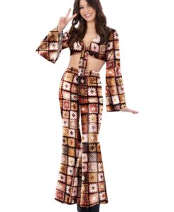 Channel true flower-power style with the Fever 60s Vintage Crochet Costume. This bold, retro outfit features a crochet-style tie crop top paired with matching flared trousers, creating an authentic 1960s hippie look with plenty of attitude.