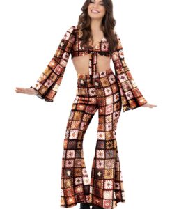 Channel true flower-power style with the Fever 60s Vintage Crochet Costume. This bold, retro outfit features a crochet-style tie crop top paired with matching flared trousers, creating an authentic 1960s hippie look with plenty of attitude.
