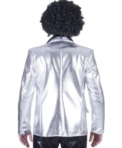 Bring futuristic disco glamour to your look with this striking Disco Fever Silver Lamé Jacket. With its high-shine metallic finish, this jacket reflects the lights beautifully, making it perfect for 1970s disco nights, retro parties and stage performances.