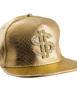 Flashy metallic gold baseball cap with bold $ logo, perfect for pimp, hip hop, 90s, bling, and money-themed fancy dress. Adjustable fit for comfort — a standout accessory that adds instant cash attitude to any outfit.