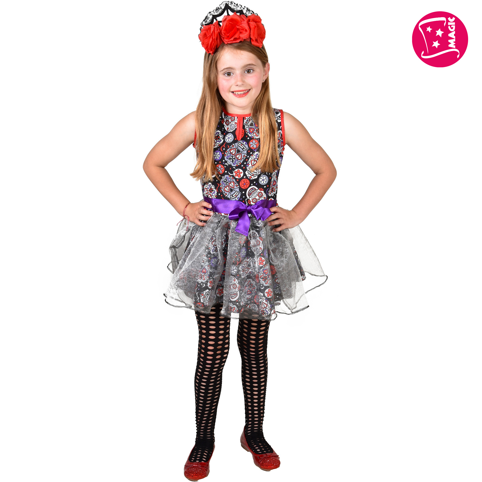 Bold, colourful, and beautifully theatrical, this Kids Day of the Dead Girl costume features a striking skull print dress finished with voile tutu-style frills for added volume and flair. Perfect for Day of the Dead themes, Halloween events, school productions, World Book Day, stage shows, and fancy dress, this dress is designed to stand out.