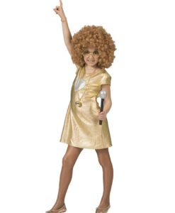 girls 70s disco dress, gold lamé dress kids, pop star costume girls, disco fancy dress children, 1970s costume kids UK