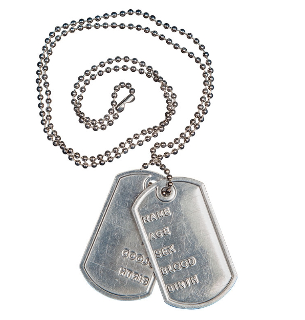 Classic army-style dog tags on a necklace, perfect for military, army, cadet, action hero, and fancy dress looks. A simple, lightweight accessory that adds instant authenticity to any uniform or costume.