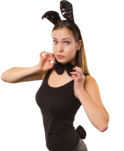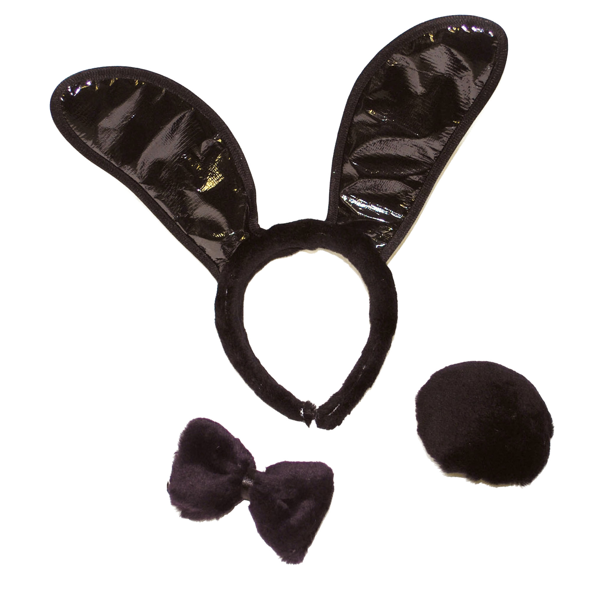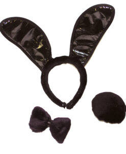 Classic black Bunny Girl accessory kit including ears on a headband, bow tie, and matching tail. Perfect for fancy dress, hen nights, parties, photo shoots, and playful costumes. A simple, stylish way to create an instantly recognisable bunny look.