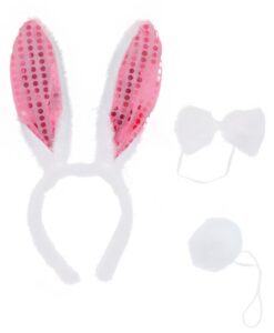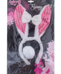 Pretty white Bunny Girl accessory kit with pink sequin trim, including ears on a headband, bow tie, and matching tail. Perfect for fancy dress, hen nights, parties, photo shoots, and playful costumes. A simple, eye-catching way to create a classic bunny look with extra sparkle.