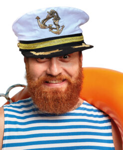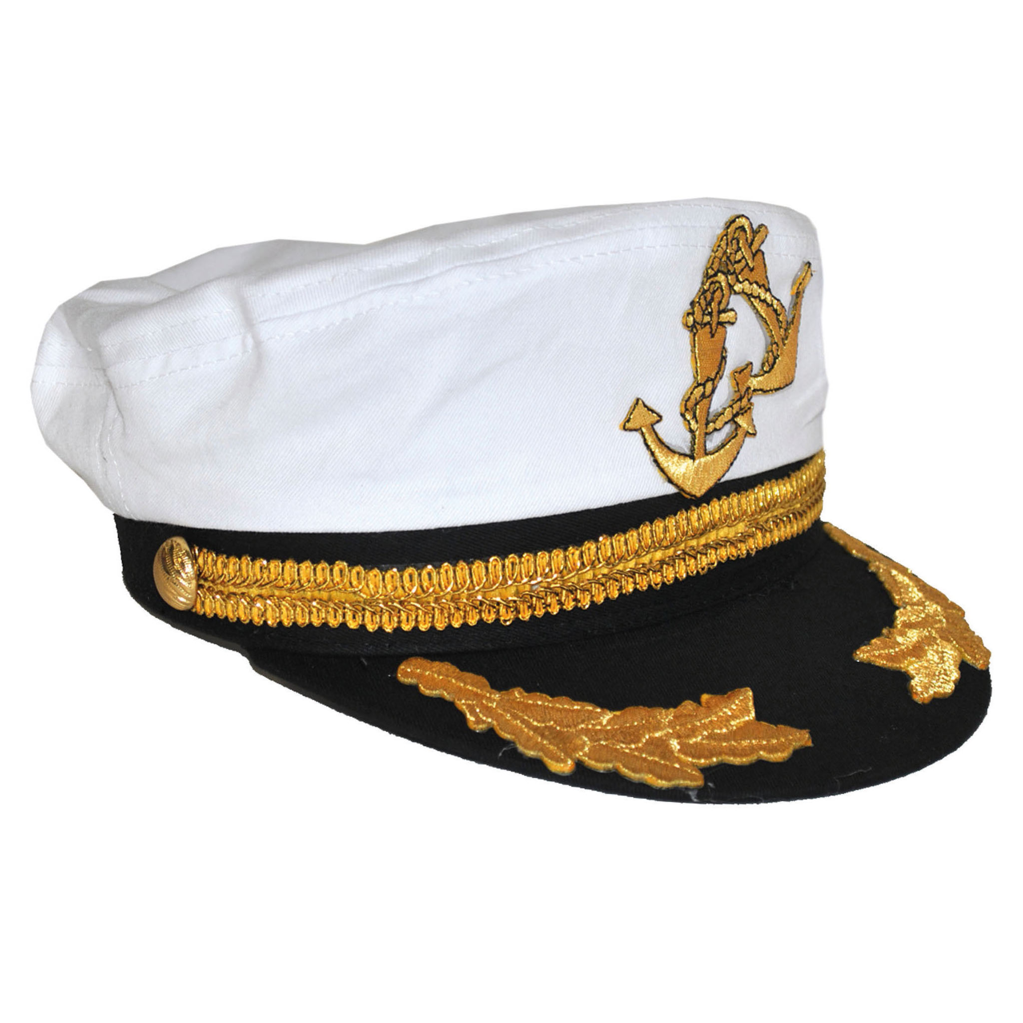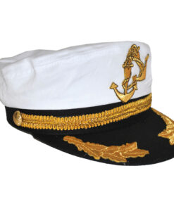 Smart deluxe captain’s cap in white with gold trim, featuring a double anchor motif on the front. A high-quality finishing touch for ship’s captains, naval officers, yacht parties, stage shows, and fancy dress.