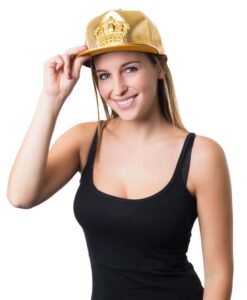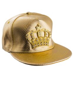 Standout metallic gold baseball cap featuring a sparkly jewelled crown motif on the front. Perfect for pimp, hip hop, 90s, bling, king/queen, and statement fancy dress looks. Adjustable fit for comfort and impact.
