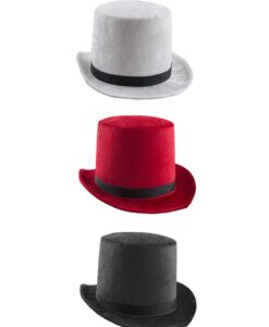 Classic top hats available in three colour options: white, red, or black. Ideal for magicians, stage shows, cabaret, dance troupes, fancy dress, and themed events. A versatile accessory that suits many looks.