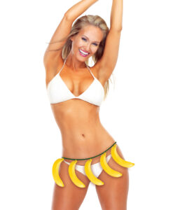 Fun tropical banana belt featuring six bananas on a string. Perfect to wear over a Hawaiian grass skirt, or to tie around a gorilla suit for a playful, novelty look. A great way to add humour and character to your costume.