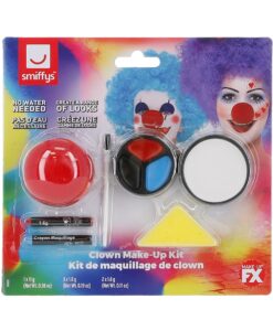 Create a fun and colourful clown look with the Smiffys Make-Up FX Clown Kit. This complete set includes multi-coloured grease facepaints, a clown nose, makeup crayons, and a sponge — perfect for circus themes, parties, Halloween, and fancy dress.