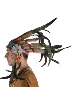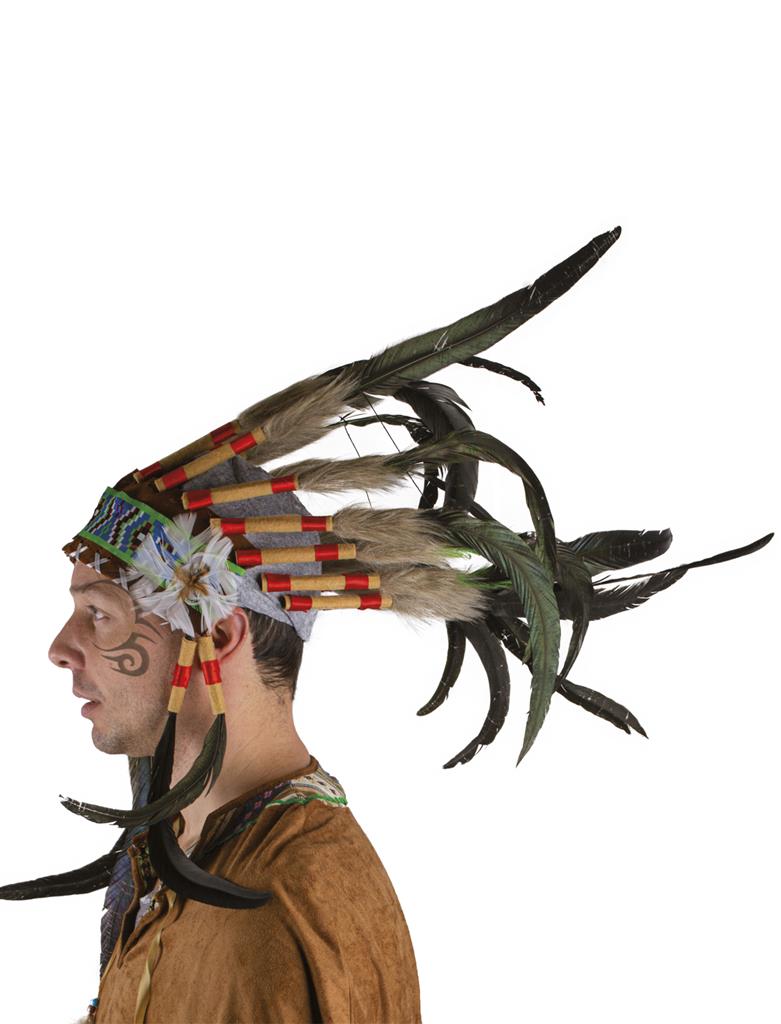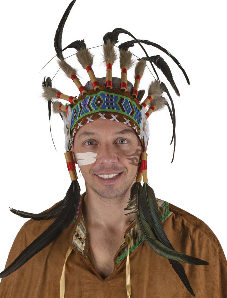 Eye-catching feathered Indian chief–style headdress with a coloured braid detail. Designed for adult wear, one size fits most. Ideal for stage shows, themed events, performances, and fancy dress, offering strong visual impact and height.